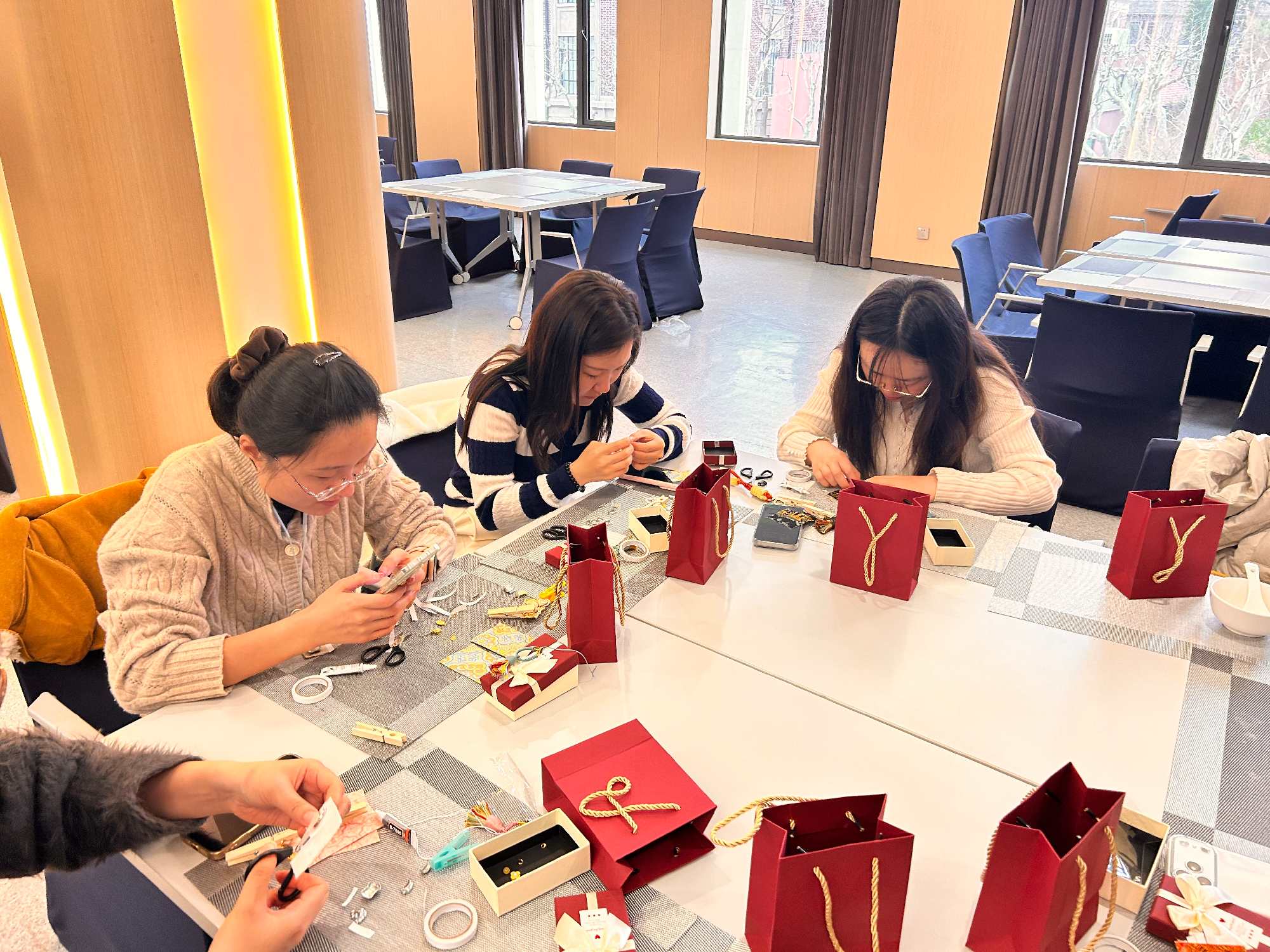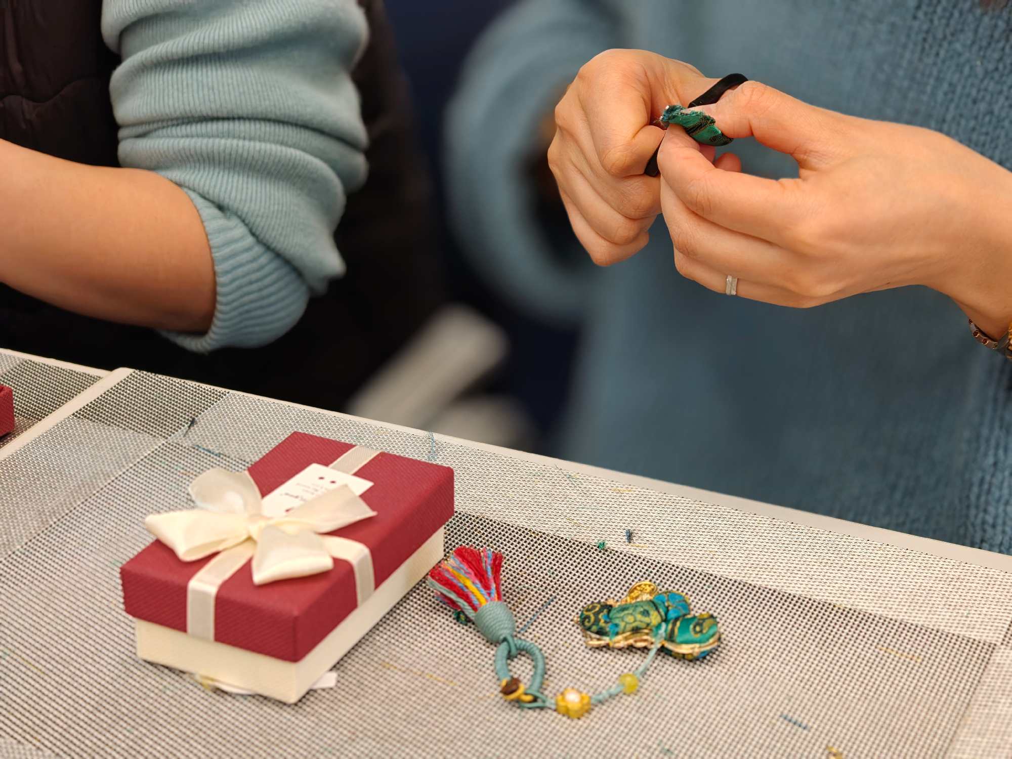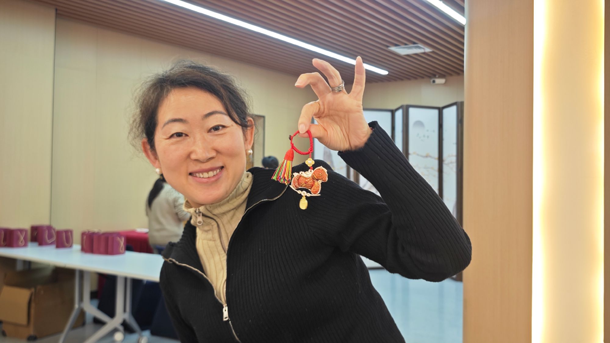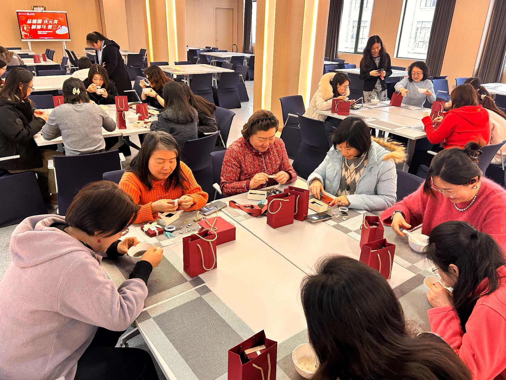 品尝甜糯的汤圆之后,女教工们又投入到宋锦小马挂件制作活动中。活动现场,各色宋锦面料、精致金属配件、编织绳线整齐摆放,大家在制作过程中相互交流、彼此协助,指尖尽显巧思。2026年是丙午马年,制作的宋锦小马挂件小巧玲珑、精致典雅,可以作为日常相伴的精致饰物,更寄托着新一年的美好期许。