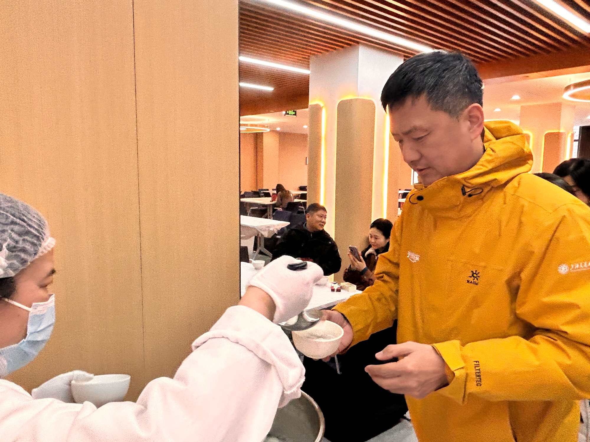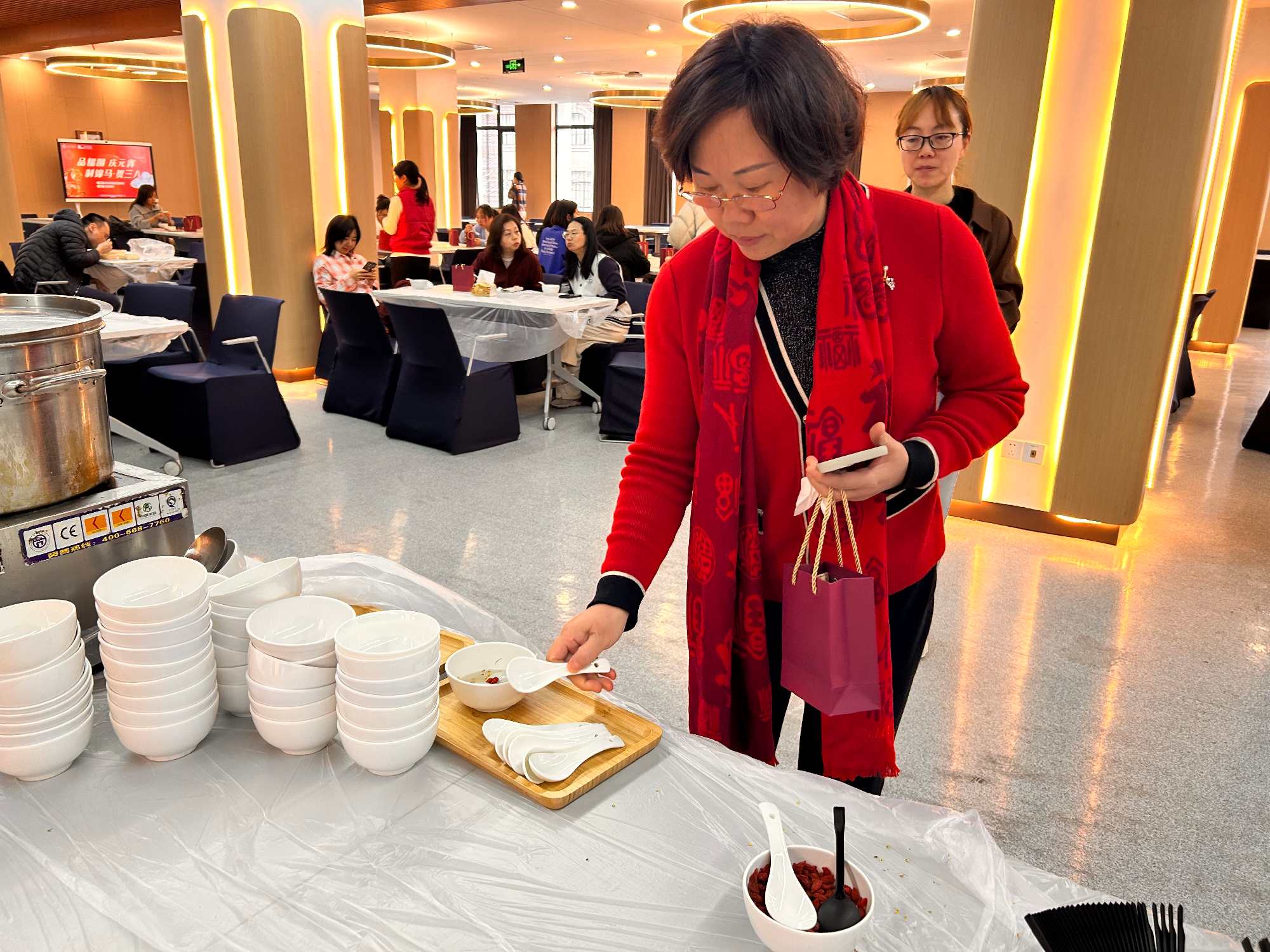 元宵佳节,软糯香甜的汤圆是必不可少的,院工会贴心准备了经典肉馅与香甜黑芝麻馅两款口味,满足不同教工的味蕾偏好。热气腾腾的汤圆盛在白瓷碗中,点缀着清香的桂花与鲜红的枸杞,既透着江南风味的雅致,又饱含“团圆美满”的美好寓意。教工们有序排队领取,手中捧着温热的汤圆,脸上洋溢着幸福的笑容,现场暖意融融,节日氛围格外浓厚。