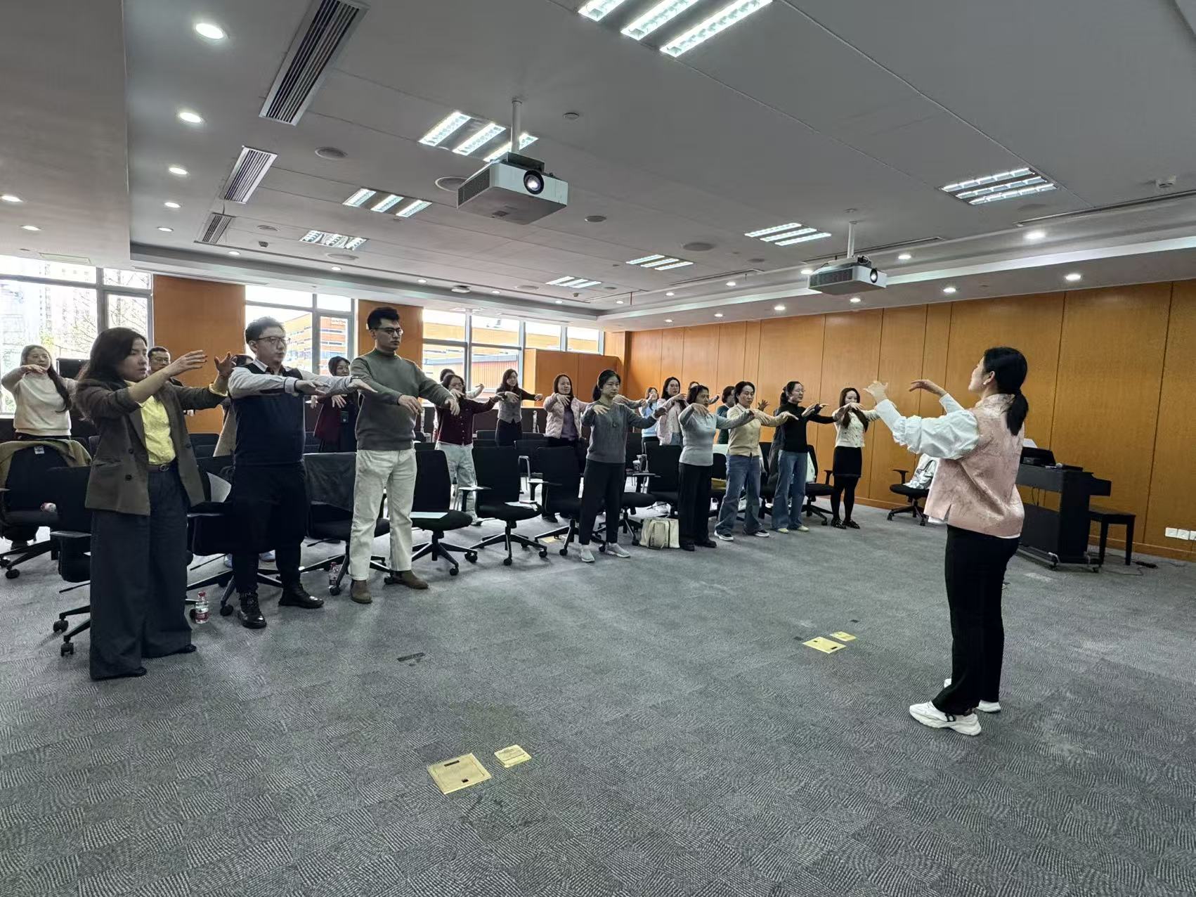 为关爱教职工身心健康,缓解教师因高频用嗓带来的嗓音疲劳问题,提升课堂发声效率与护嗓意识,3月26日中午,安泰经管学院工会精心策划并举办了“走进上音”音乐午间沙龙(第一期)。本次活动以“声润课堂 歌暖人心——高校教师科学发声护嗓训练与合唱体验”为主题,特邀上海音乐学院艺术管理系教师张悦担任主讲人,为学院教师带来一场兼具专业性与愉悦感的音乐体验。