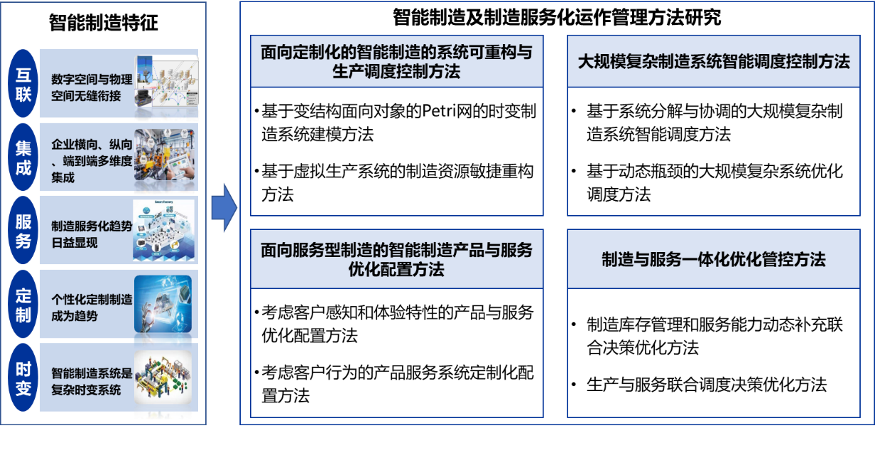 对于企业而言,智能制造和服务型制造是企业实现高质量发展的重要途径,是企业向产业价值链高端转型重要驱动力。然而,随着全球化市场的竞争越来越激烈,客户需求个性化程度越来越高,企业生产模式逐渐从大批量制造模式向多品种小批量的制造模式转变,从面向库存生产向面向订单生产转变,从单工厂的生产向网络化生产转变,从销售产品向提供产品与服务系统转变。这些转变对企业生产与服务运作管理方法提出了更高的要求,传统的针对稳定产品大规模生产的集中式和确定性的生产计划和调度方法不再适用,需要考虑企业在向智能制造互联、多维度集成、系统时变、定制需求及服务化等新特征,提出新的运作管理理论方法,解决制造资源自组织与可重构、大规模复杂制造网络协同化生产计划、制造与服务一体化(制造服务化)、自适应与前瞻性生产调度控制等关键问题。