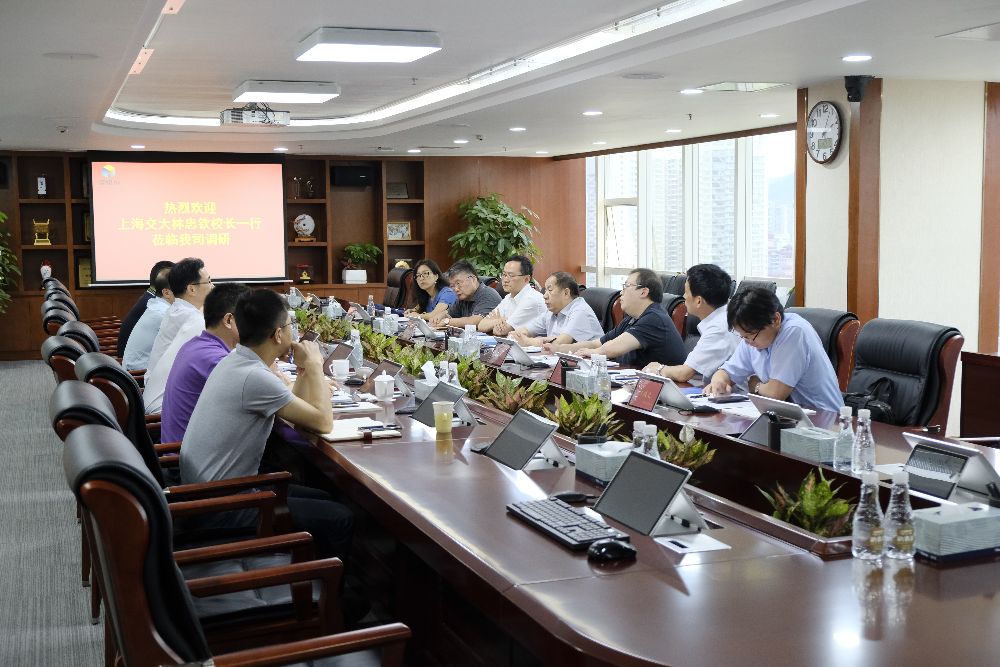 王勇健校友对林忠钦校长一行的来访表示欢迎,并详细介绍了深投控的总体情况和战略规划。他表示,深圳近年来在推动创新创业方面取得了显著成果,形成了独具特色的科技创新产业和生态环境,具备了较强的科技产业化优势,而上海交大科研实力雄厚、人才储备丰富,尤其在工科实业方面优势突出。他希望未来深投控和上海交大能够加强在基础研究、产学研一体化、高科技人才培育等方面的合作交流,加快推动相关合作项目在深圳落地,共同助力深圳战略性新兴产业、未来产业规划和前瞻布局,为粤港澳大湾区打造国际科技创新中心作出贡献。