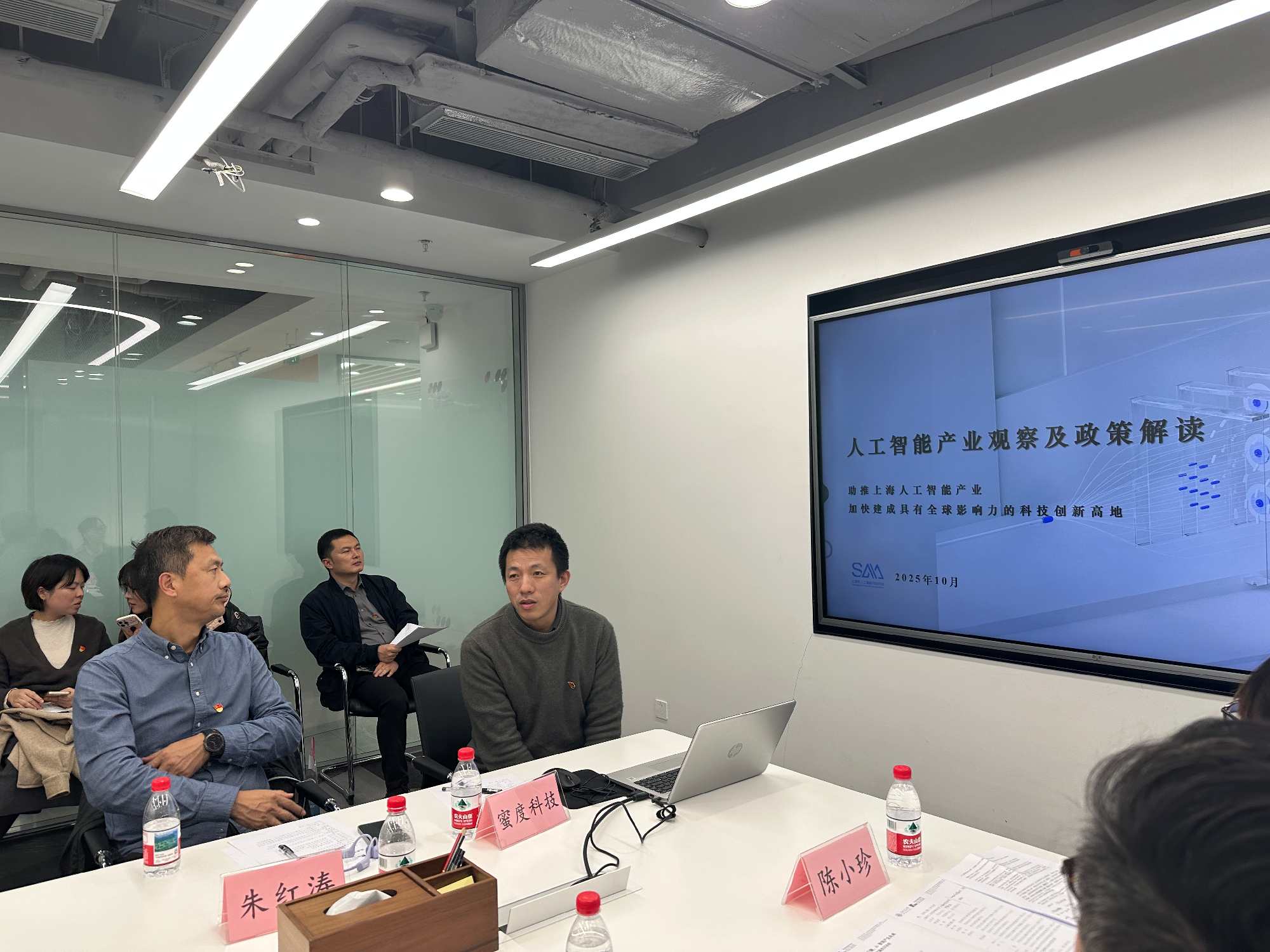 随后上海市人工智能行业协会秘书长、MTT 2025级学生钟俊浩主持党建引领业务交流会。首先,上海市人工智能行业协会党支部书记、副秘书长徐琦系统介绍了上海人工智能产业的发展成效与政策体系。重点解读了上海围绕“模型、语料、算力、生态、场景、资本”新六大要素推出的 “12条政策措施” ,包括算力补贴、语料支持、开源生态建设等,旨在降低企业创业成本、构建“热带雨林”式创新生态。
