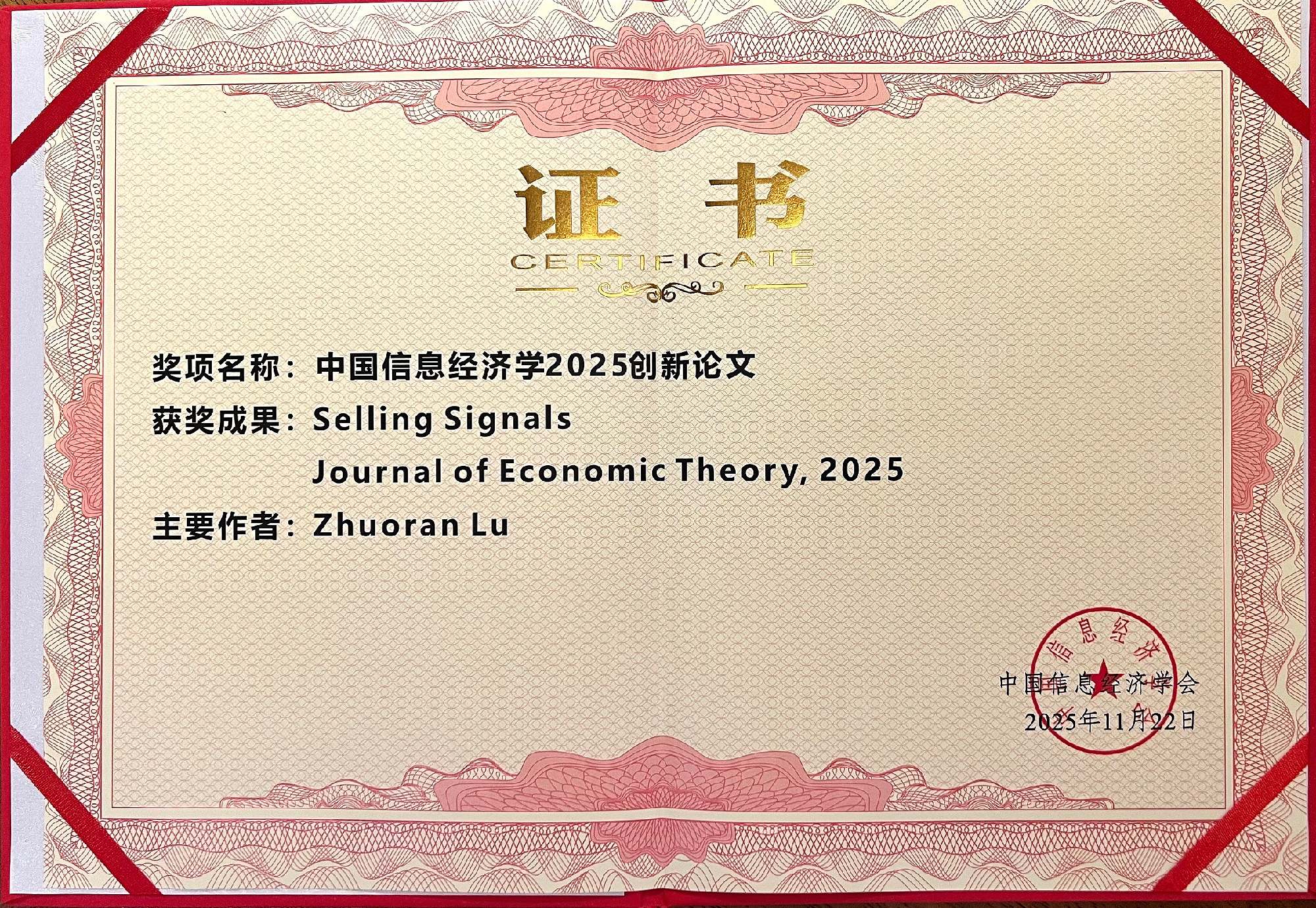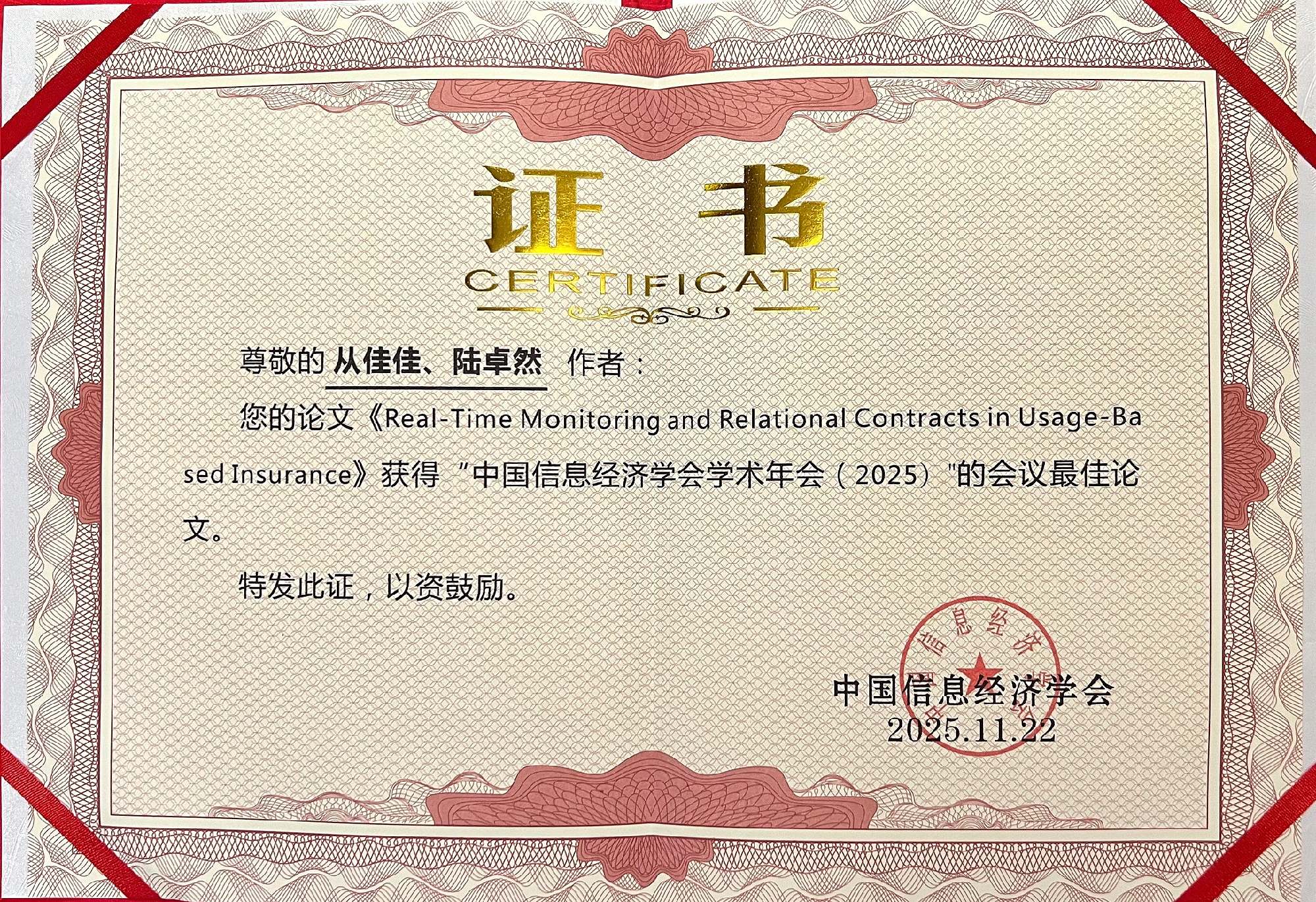 陆卓然助理教授和魏煊副教授荣获中国信息经济学会创新论文奖 发布时间:2025-12-09