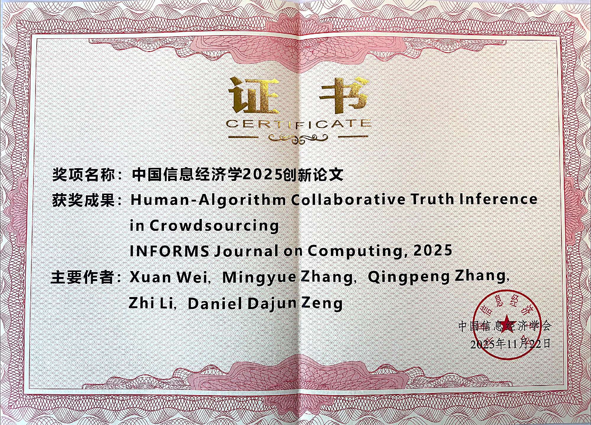 2025年11月21-23日,由中国信息经济学会主办的“中国数字经济与管理学术年会”在海南陵水举行。会上公布了本年度中国信息经济学会“创新论文奖”评选结果。贝博官网陆卓然助理教授以独立作者身份发表于Journal of Economic Theory 的论文《Selling Signals》和魏煊副教授以第一作者身份发表于INFORMS Journal on Computing的论文《Human-Algorithm Collaborative Truth Inference in Crowdsourcing》荣获创新论文奖,并受邀作大会特邀报告。此外,陆卓然助理教授与合作者从佳佳共同撰写的论文《Real-Time Monitoring and Relational Contracts in Usage-Based Insurance》荣获会议最佳论文。