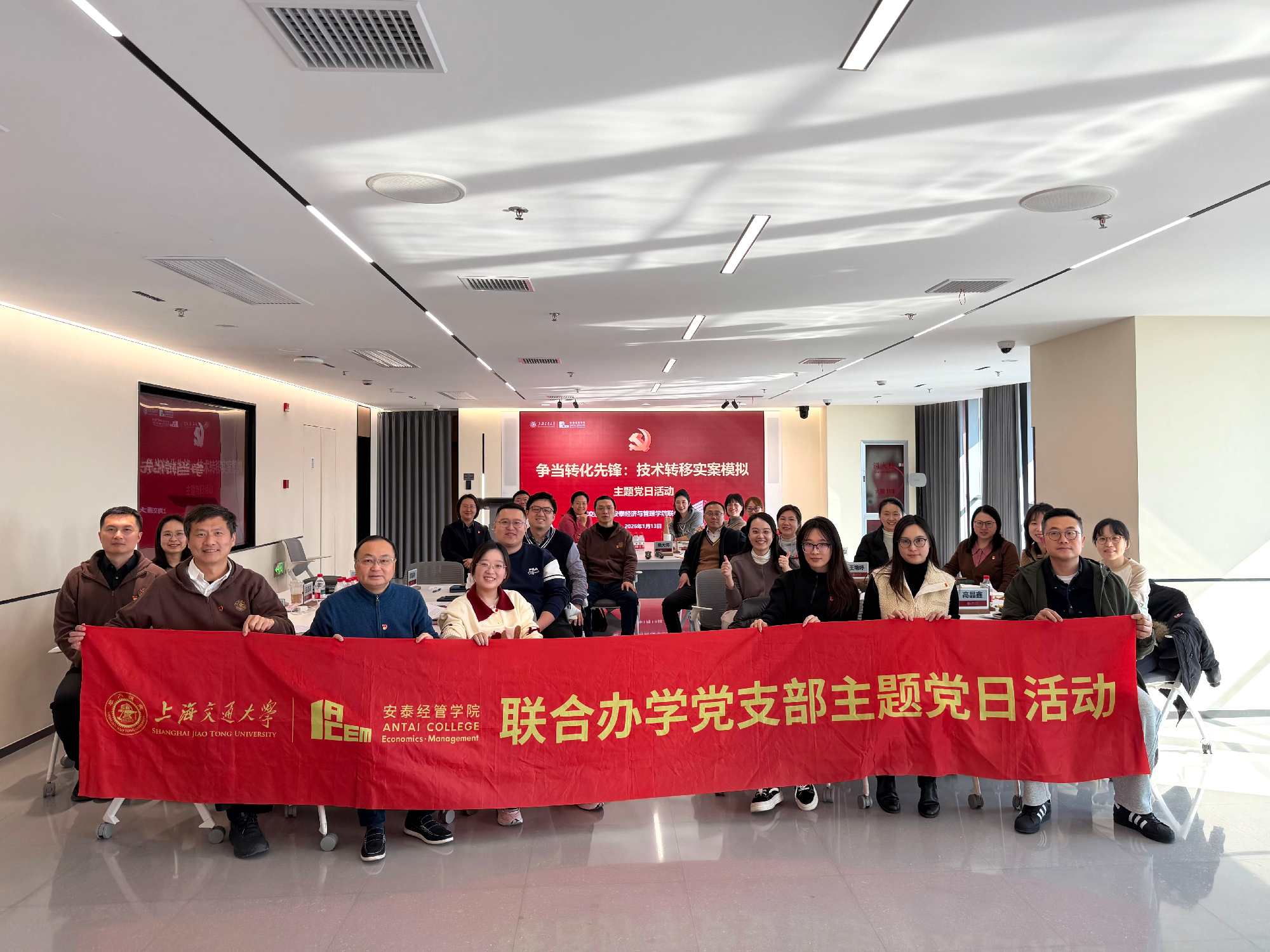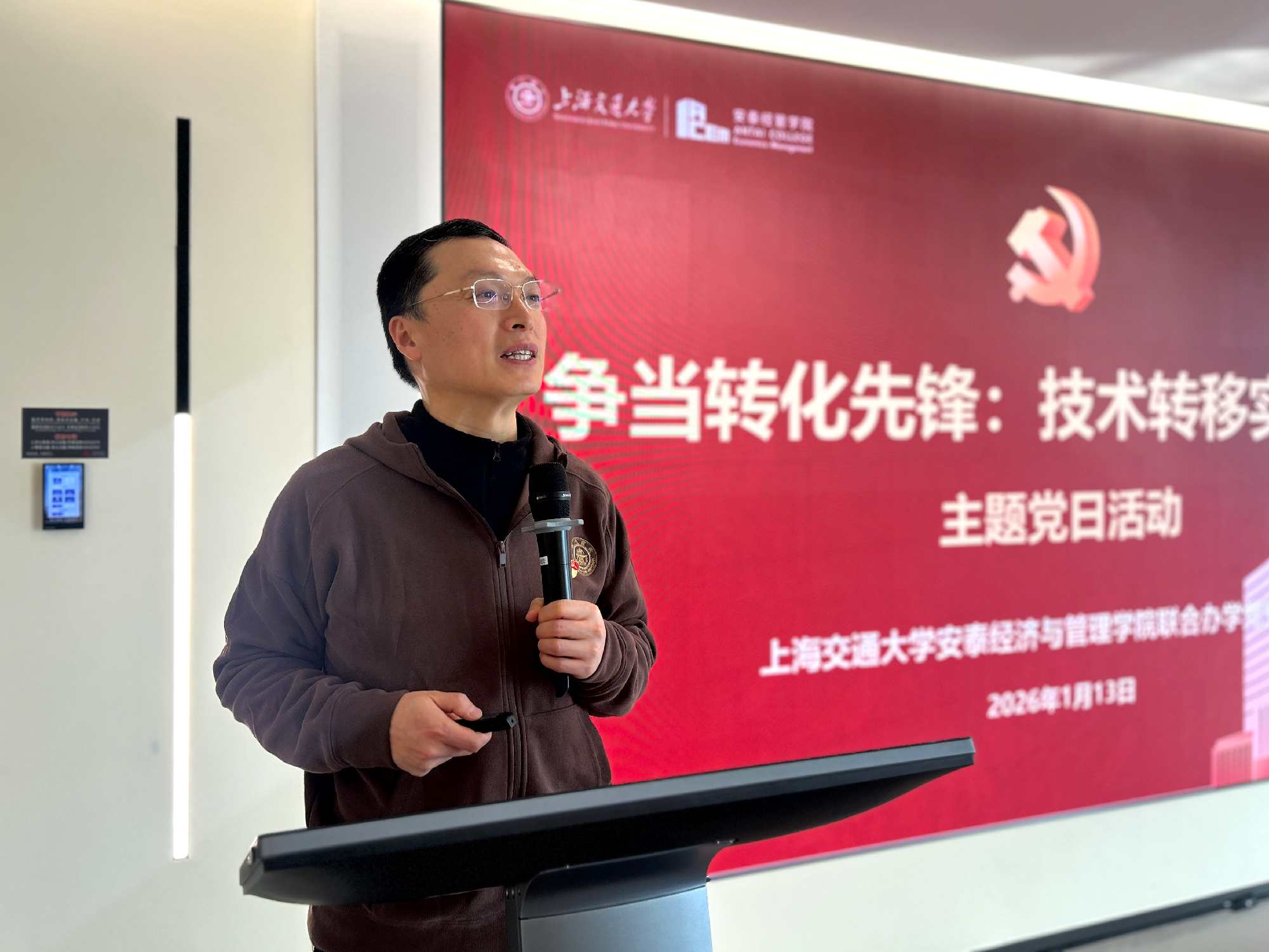 为深入贯彻落实创新驱动发展战略,强化党建对科技成果转化工作的引领作用,搭建技术转移实践交流平台,2026年1月13日下午,BB贝博艾弗森BB贝博艾弗森(以下简称交大安泰)联合办学党支部在徐汇校区浩然高科技大厦24楼成功举办“争当转化先锋:技术转移实案模拟”主题党日活动。交大安泰副院长桑大伟,交大中银科技金融学院产教融合发展中心主任、联合办学党支部书记陈建科,交大安泰高管教育中心主任、联合办学党支部副书记高晶鑫,上海交大系统生物医学研究院研究员、党委委员兼科研创新党支部书记徐岷涓等出席活动,联合办学党支部党员、MTT党员学生与校友代表参与此次活动。