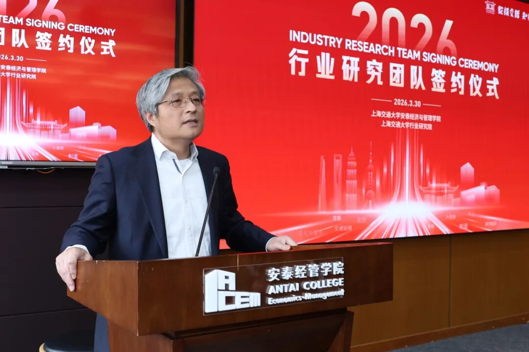 在付世晓、姜文宁、李厚锐、朱庆华、瞿茜、田新民的见证下,陈方若代表安泰经管学院、行业研究院同第八批行业研究团队代表进行签约。