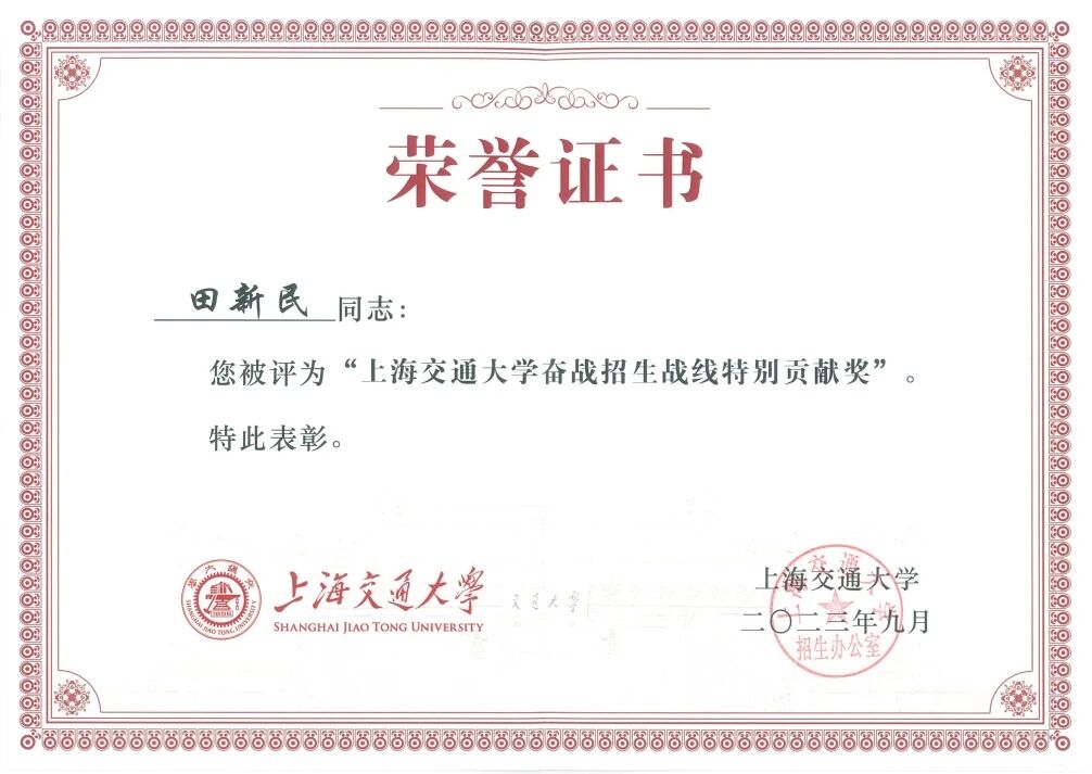 在他的推动下,2021至2024年,推动学院基金捐赠现金到账近1亿元,在年度募资额与捐赠人次上,屡创新高、蝉联全校第一。近五年,田新民负责新疆本科招生开始,推动交大在当地的生源质量稳步攀升,录取位次实现提升并持续稳居前列。同时,田新民联动海内外校友,筹集3000万工程馆修缮基金,成为校友助力母校发展的生动范例。