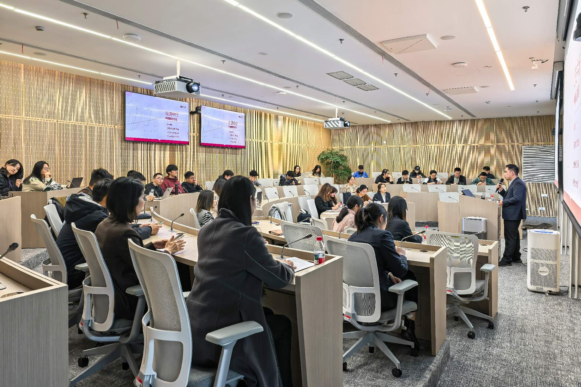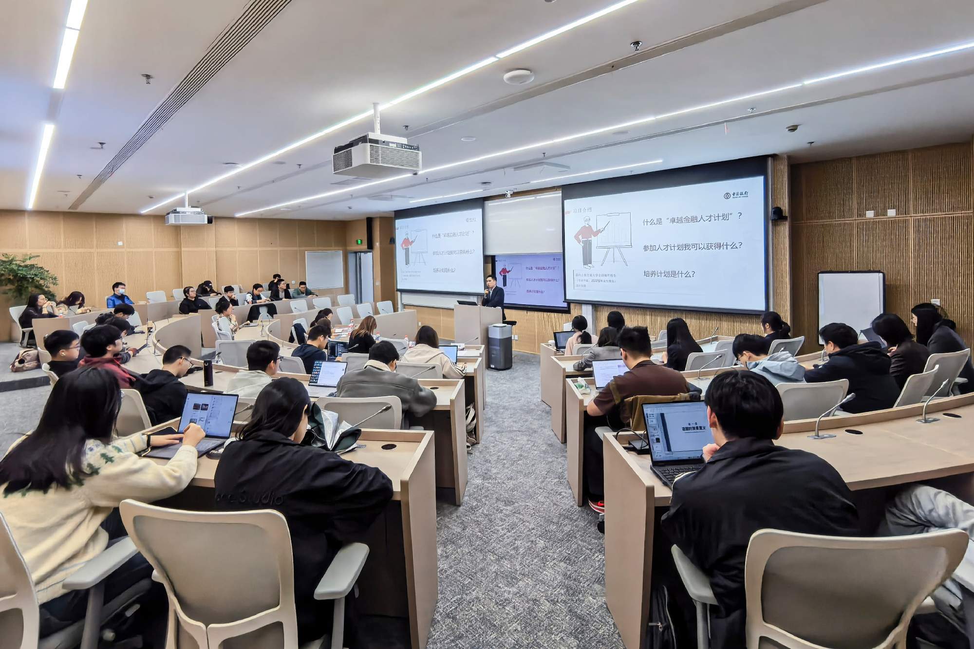 活动现场,中国银行上海市分行人力资源部经理倪俊详细介绍了中国银行百余年的发展历程,对第二期交大中行班“卓越金融人才计划”项目概况、招募流程及培养计划做了重点解读;BB贝博艾弗森2024级金融硕士冯诗宇作为首期交大中行班学员代表,分享了自己参与项目的学习收获与成长感悟;中国银行徐汇支行客户经理张子妍作为校友代表,结合自身的工作体会和对银行业的理解,为在场的学弟学妹们提供了宝贵的行业实践经验。